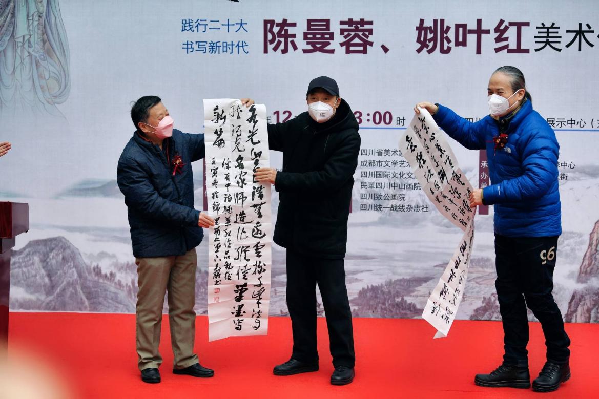 开幕式上,四川省政府文史研究馆徐有中、徐寿鹏和殷躍轩三位馆员还联手向展览赠送了他们专门创作的诗书。据悉,本次画展以“践行二十大、书写新时代”为主旨,展出了陈曼蓉、姚叶红两位画家40余幅作品。两位画家以激情洋溢的笔墨色彩、深厚宏大的画面形式,表达了对新时代深情的讴歌和祝愿、对人民幸福美满生活的赞美。