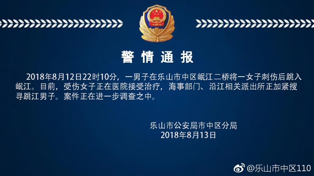8月13日凌晨2点10分,四川乐山市中区公安分局发布警情通报:2018年8月12日22时10分,一男子在乐山市中区岷江二桥将一女子刺伤后跳入岷江。目前,受伤女子正在医院接受治疗,海事部门、沿江相关派出所正加紧搜寻跳江男子。案件正在进一步调查之中。