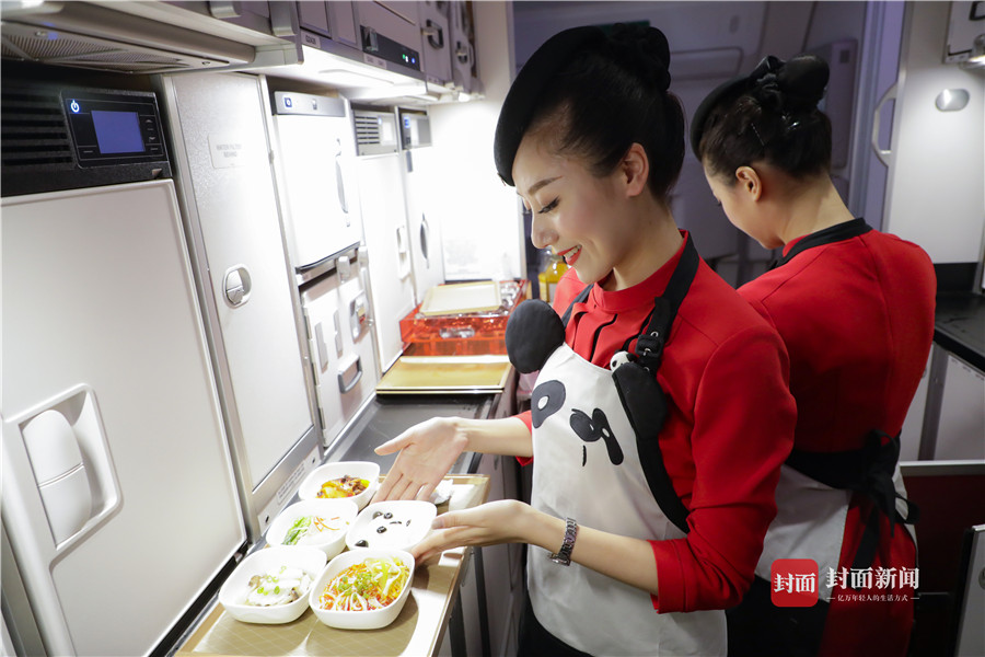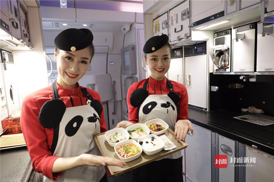 除了将熊猫卡通形象绘上彩色机身,熊猫元素也贯穿“熊猫客机”整个飞行旅程。