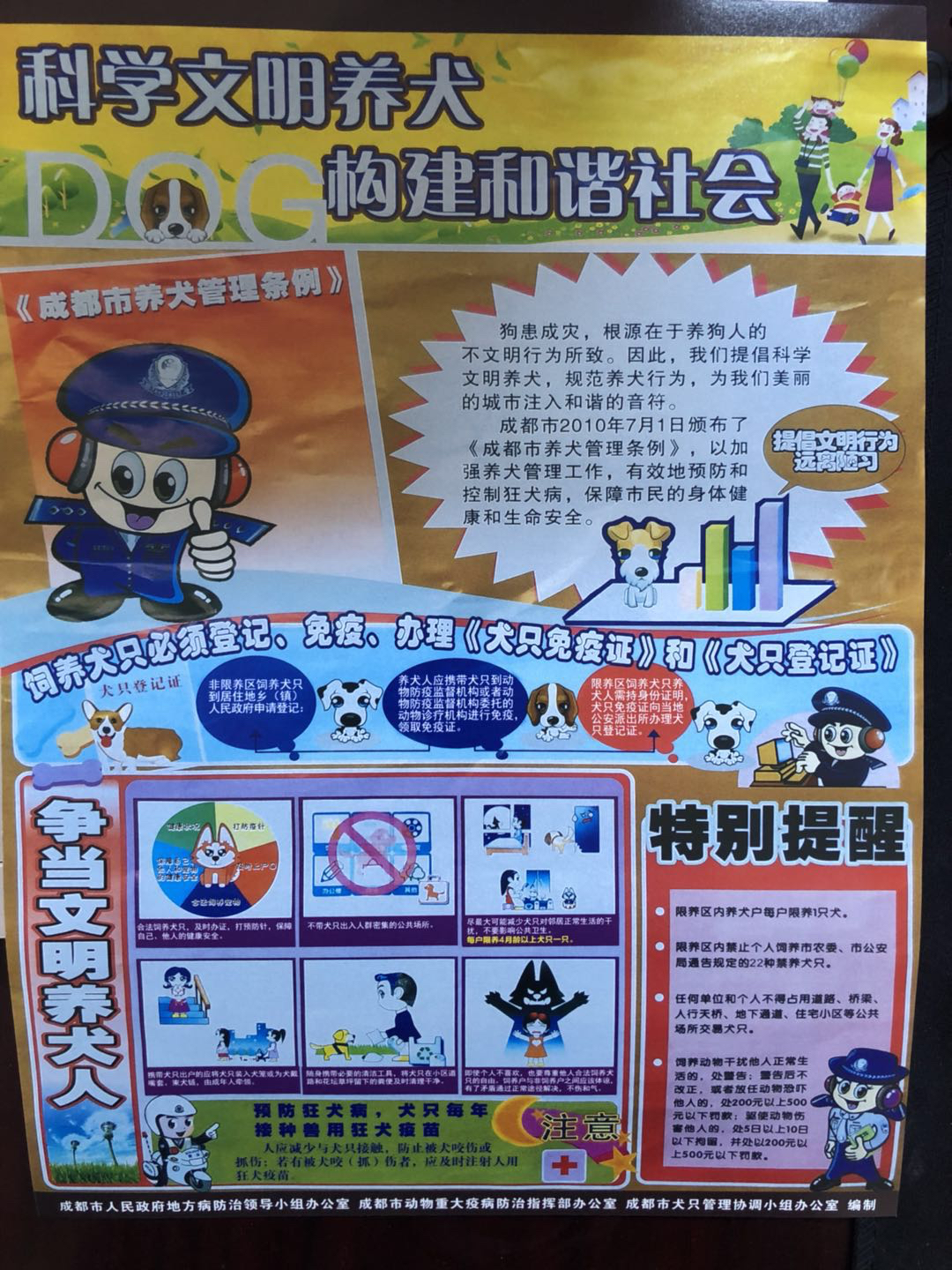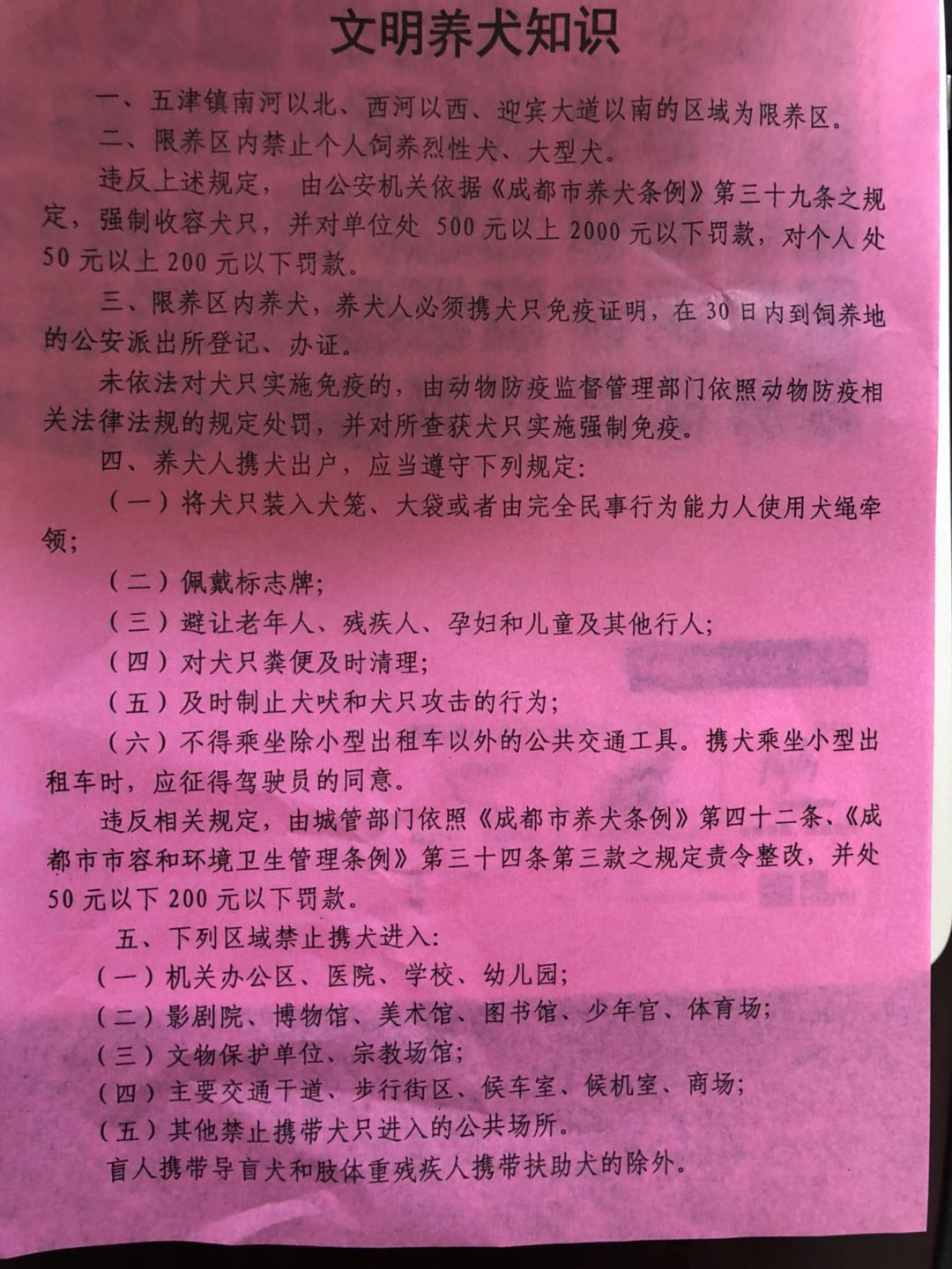 23日晚,新津县公安局走上街头,为大家发放传单,内容包括文明养犬知识、禁养犬种类以及科普《成都市养犬管理条例》。因为关心自家的狗狗如何养、街上的流浪狗如何处置,一些市民在看到后也主动向民警询问。“这种狗能不能养?”“狗证咋个办”“流浪狗被抓了送到哪去呢?”,不少市民表示,犬只的不规范管理带来了环境污染和人身安全的威胁,“还是要好好整治下,万一咬到人了呢?”
