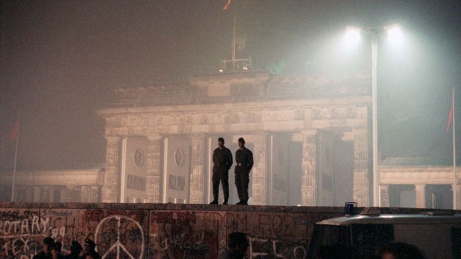 1989年11月的档案照片,两名东德边防士兵在柏林墙上巡逻,背景是勃兰登堡门。(图片:AP/Jockel Finck)