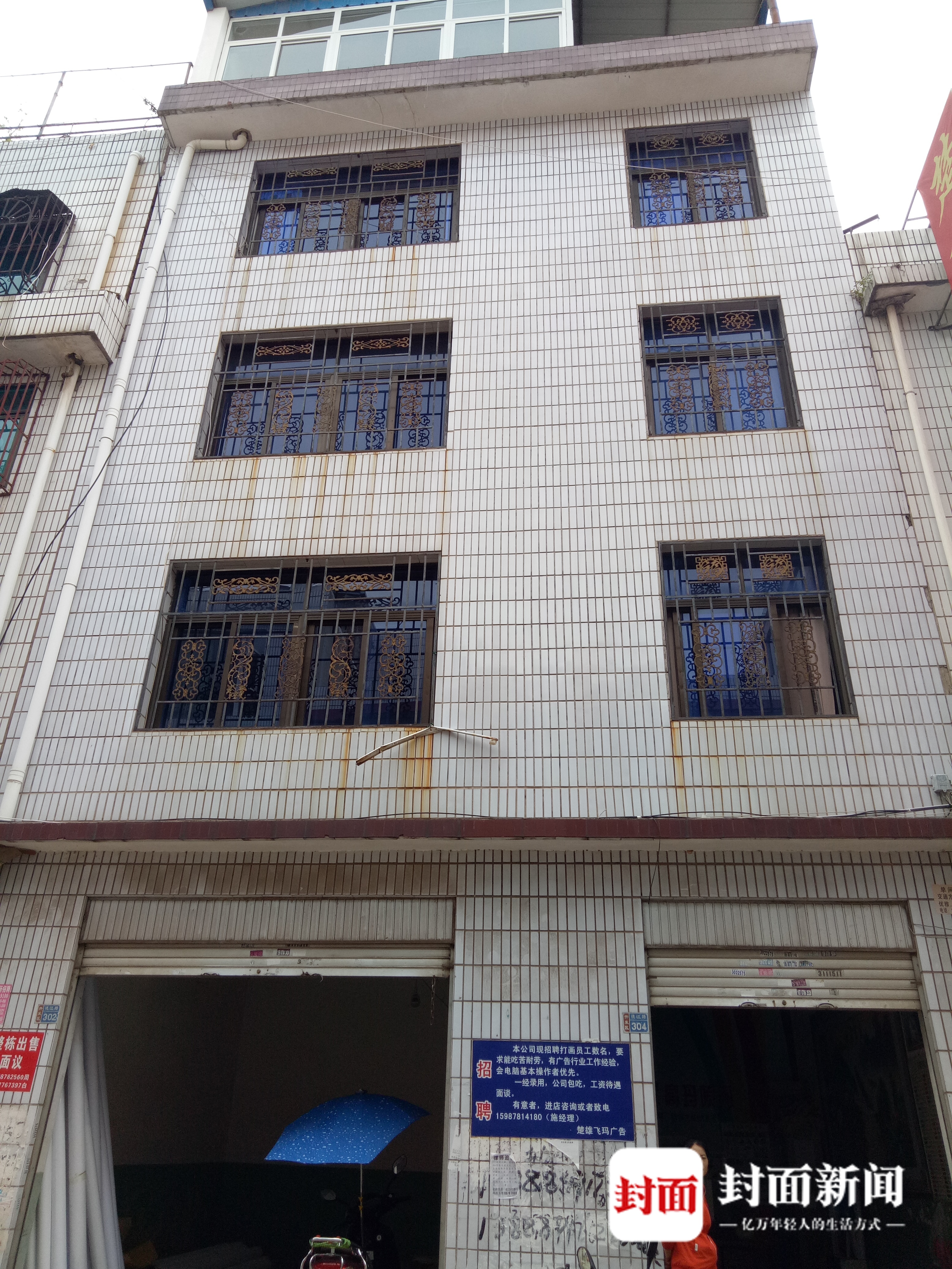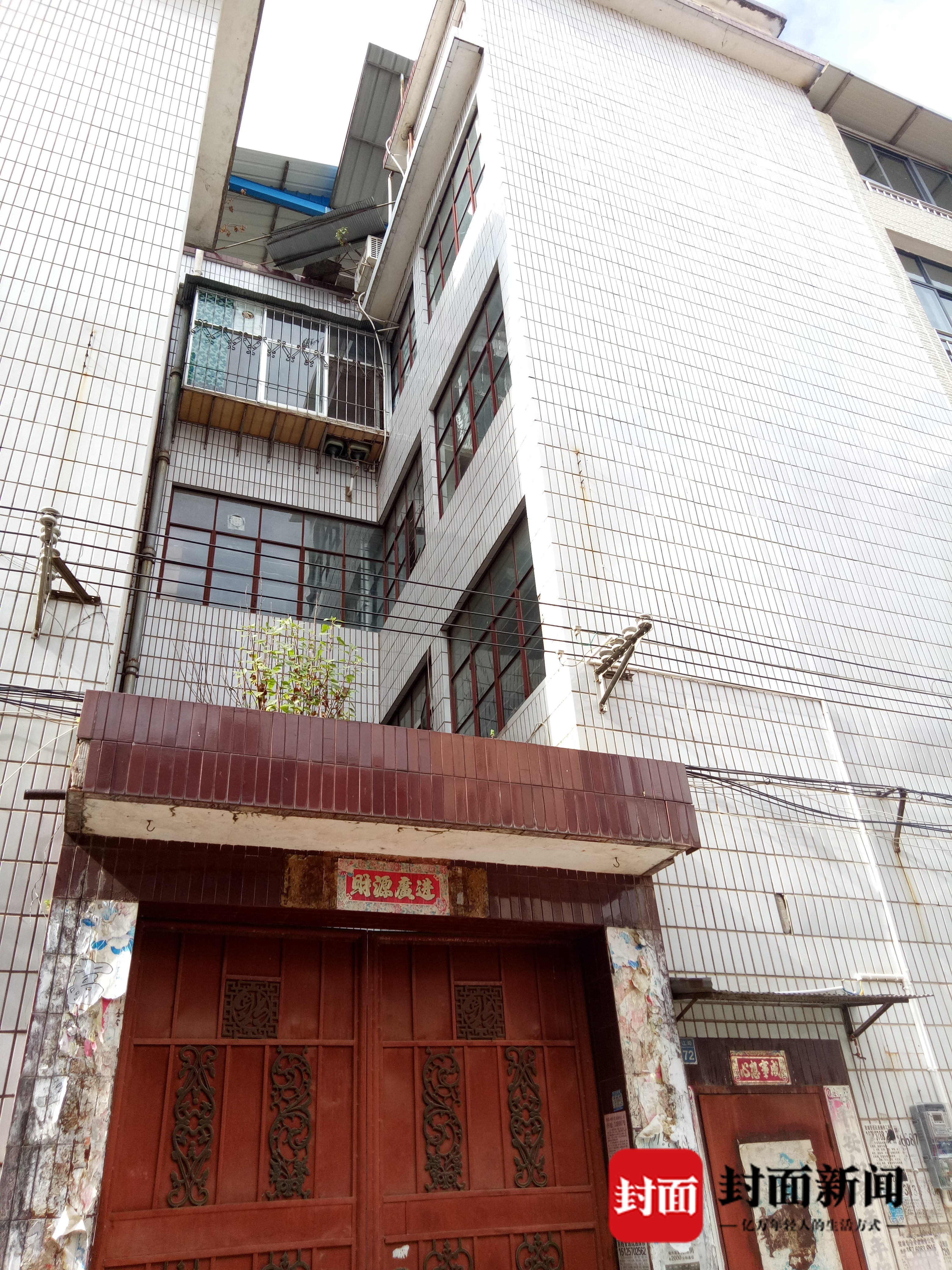 这是一幢4层楼民房,主人是一对80多岁的老夫妇。房屋修建于上个世纪90年代。约1.5米宽的铁门上,红色的油漆已经斑驳,墙两边贴满了小广告。