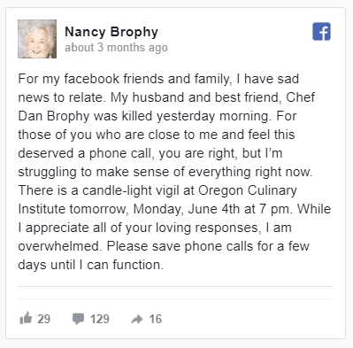 一天后,南希在Facebook上发布了一个帖子,向公众宣布了丈夫的死讯,“我有悲伤的消息要告诉大家。我丈夫,也是我最好的朋友,厨师Dan Brophy昨天早上被杀害。我十分难过,希望大家暂时不要联系我。”并表示她正在“努力接受现在的一切”。