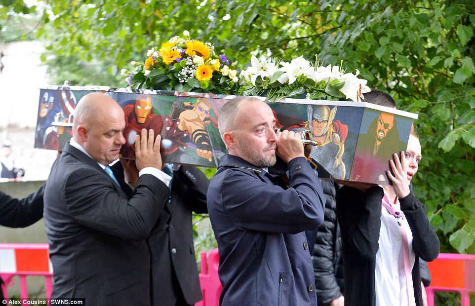 8岁的布兰登棺材上绘有包括钢铁侠和美国队长在内的漫威漫画人物的画像。