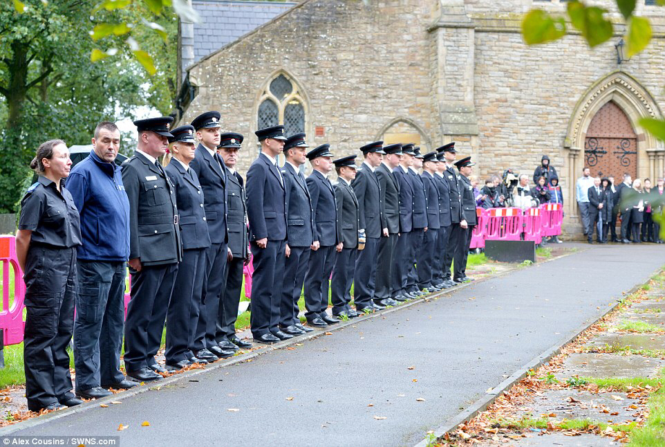 教堂外有令人心碎的场面,试图拯救四名孩子生命的消防队员在送葬队伍到来之前组成了仪仗队。