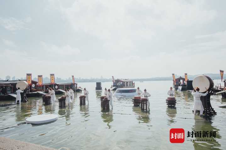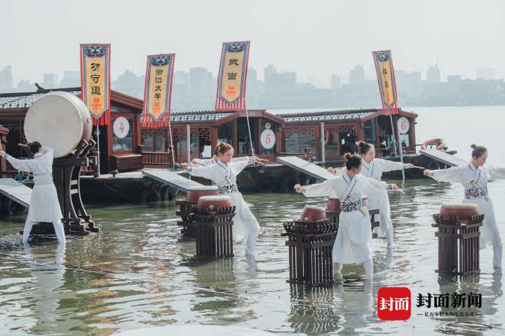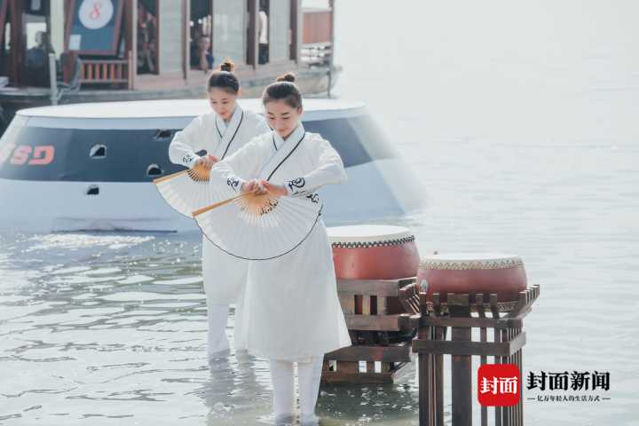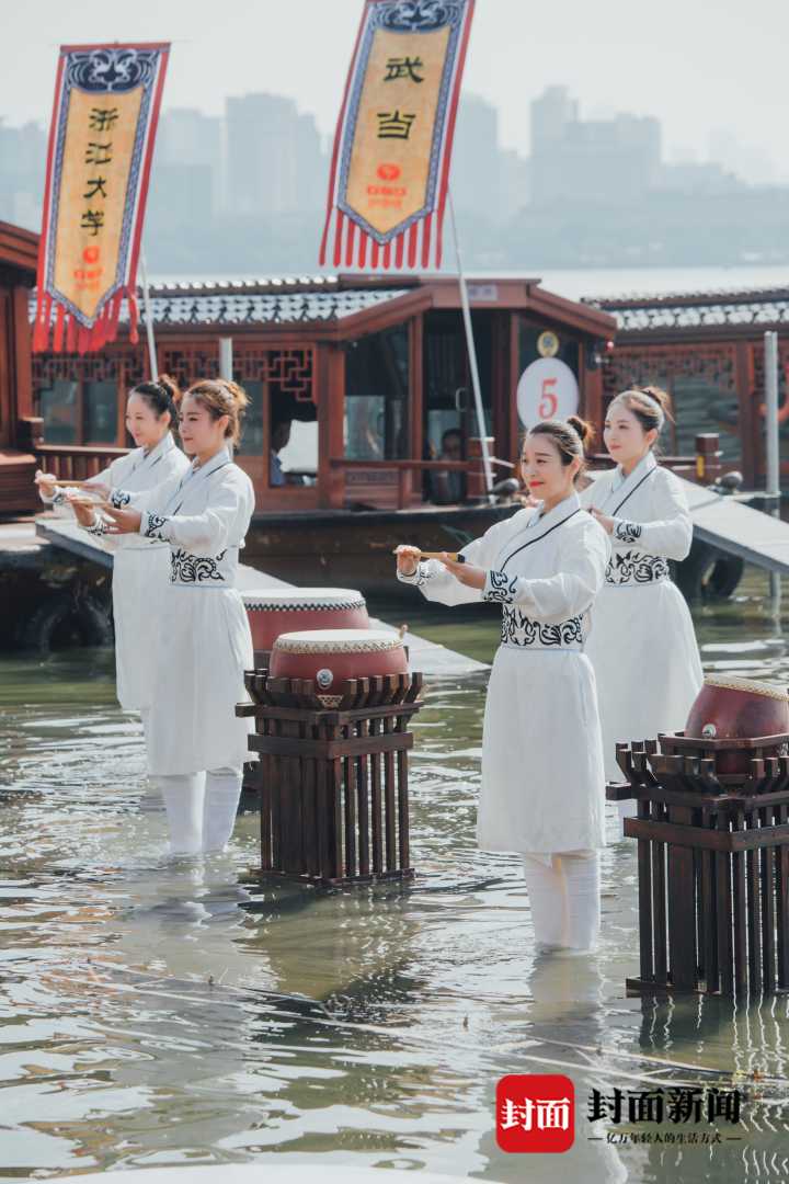 原来,这是浙江小百花越剧团的年轻演员,在活动中带来的6分钟跨界表演《吴越鼓乐·十八相送》,“恩仇快哉攻守道,纵情恣意淋漓间。”鼓乐响彻水面,惊艳众人。“不是越剧么,姑娘儿怎么比男人家打得还要好啊!”