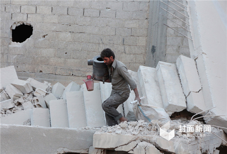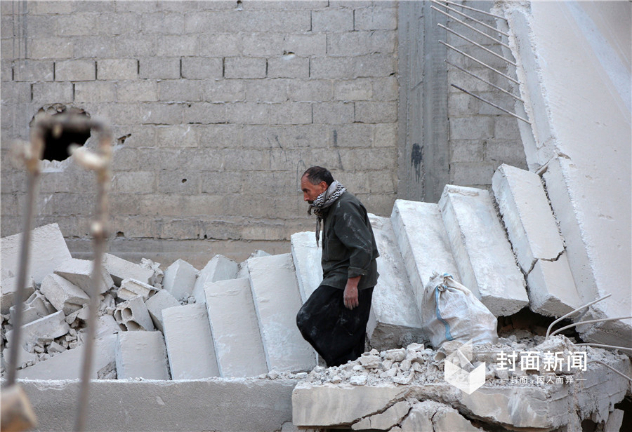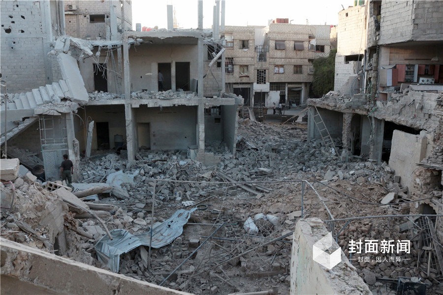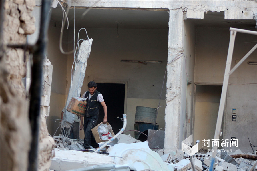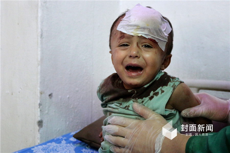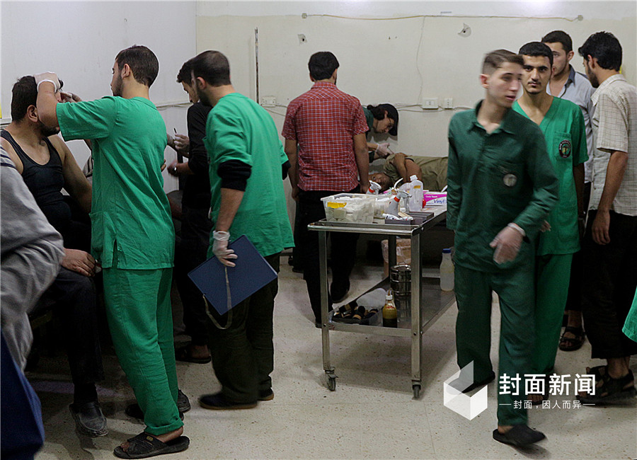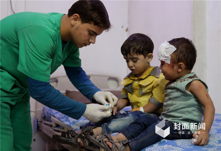 当地时间2016年10月10日,叙利亚大马士革,叙利亚政府军对当地阿尔宾镇住宅区进行空袭,受伤民众送往医院治疗。