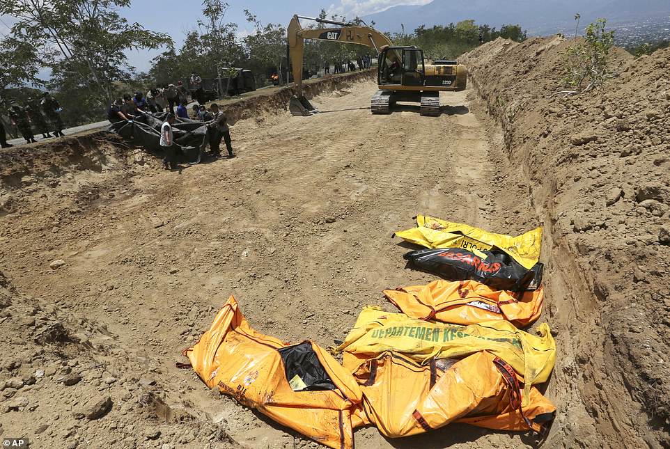 这段视频曝光之际,灾难造成的死亡人数已攀升至1234人,人们还为在周五地震和海啸中成百上千的遇难者准备了一个集体墓穴。从一些视频和图片中可以看到,人们将尸袋拖进帕鲁(Palu)330英尺(约100米)长的坟墓。