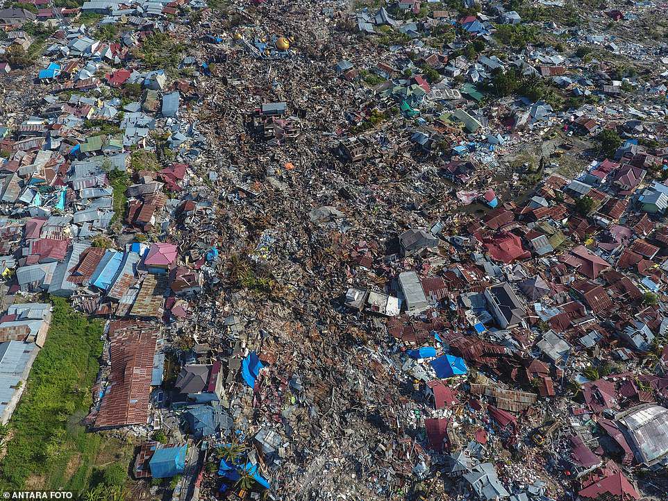 图片显示了苏拉威西中部帕鲁市被海啸摧毁后的破坏程度。