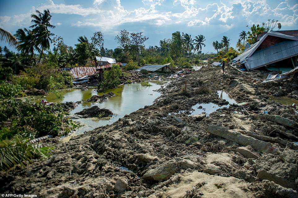 苏拉威西岛佩托博村的建筑在毁灭性的地震后被夷为平地,淹没在泥中。