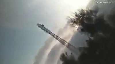 从一所房子屋顶上拍摄的恐怖视频显示,大型建筑和电塔连着地基整块在泥河上漂移。
