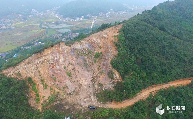 2016年10月13日,湖南省湘乡市育塅乡田坪村云盘寨山,一巨大的“天坑”如破开的鱼腹镶嵌在青山之中,其景象与邻近的山林显得极不协调。