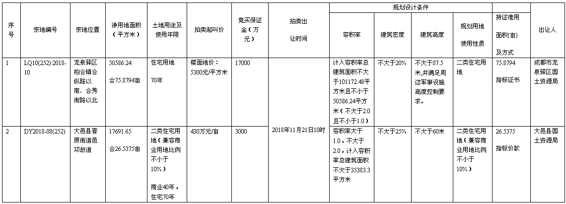 11月1日,成都市公共资源交易服务中心发布最新土地拍卖公告显示:龙泉驿区柏合镇及大邑县城区分别新增1宗住宅类用地供应,共计102亩,定于11月21日10时拍卖出让。