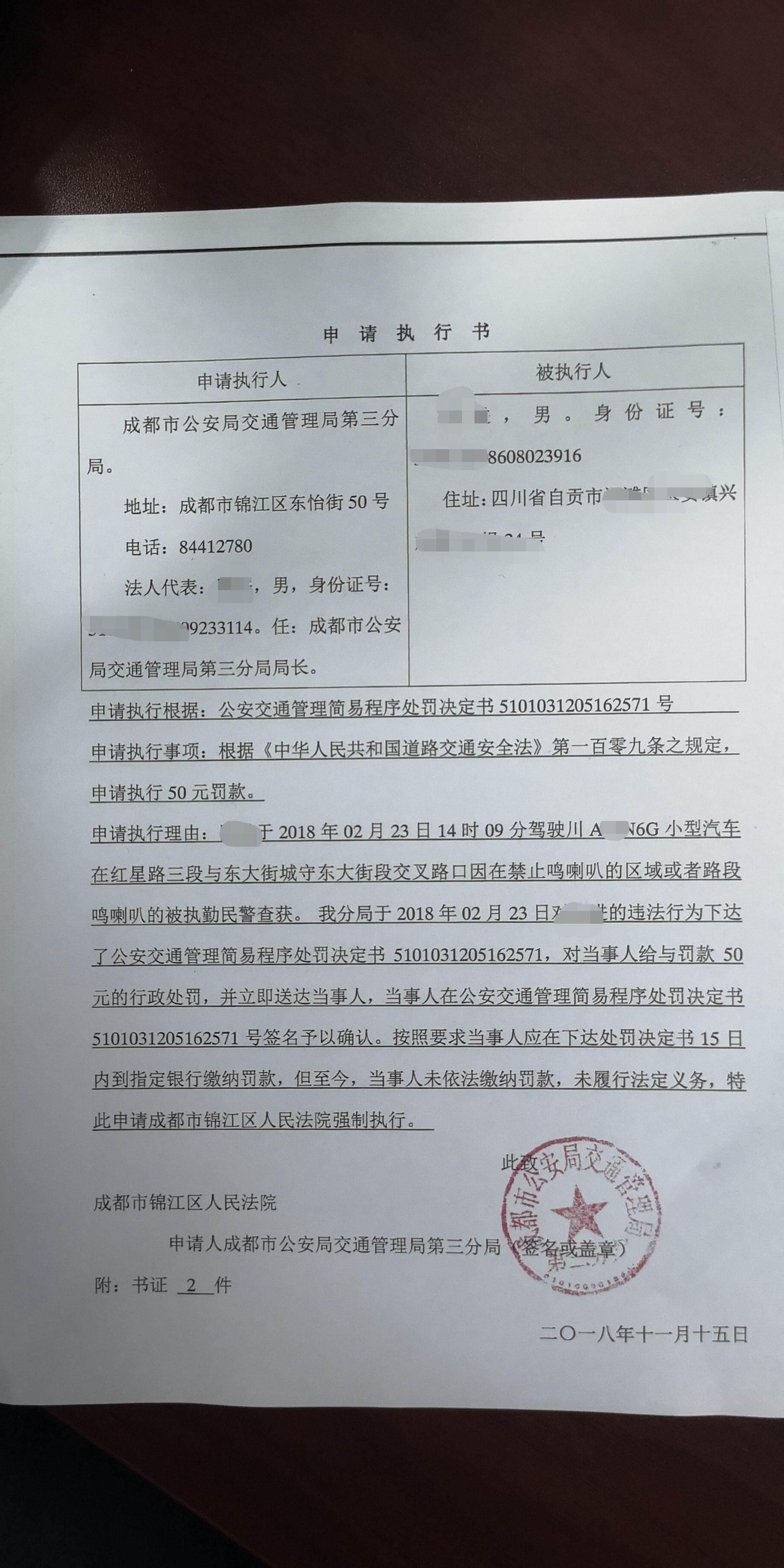 11月27日上午,成都交警三分局内,封面新闻记者见到了民警出示的一份《申请执行书》。上面显示驾驶员阳某2月23日在红星路三段与东大街城守东大街路口因乱鸣喇叭被执勤民警查获,随后民警对阳谋下达了处罚决定书,阳谋在处罚书上签字确认,依据《道法》规定,阳谋将被处罚款50元。