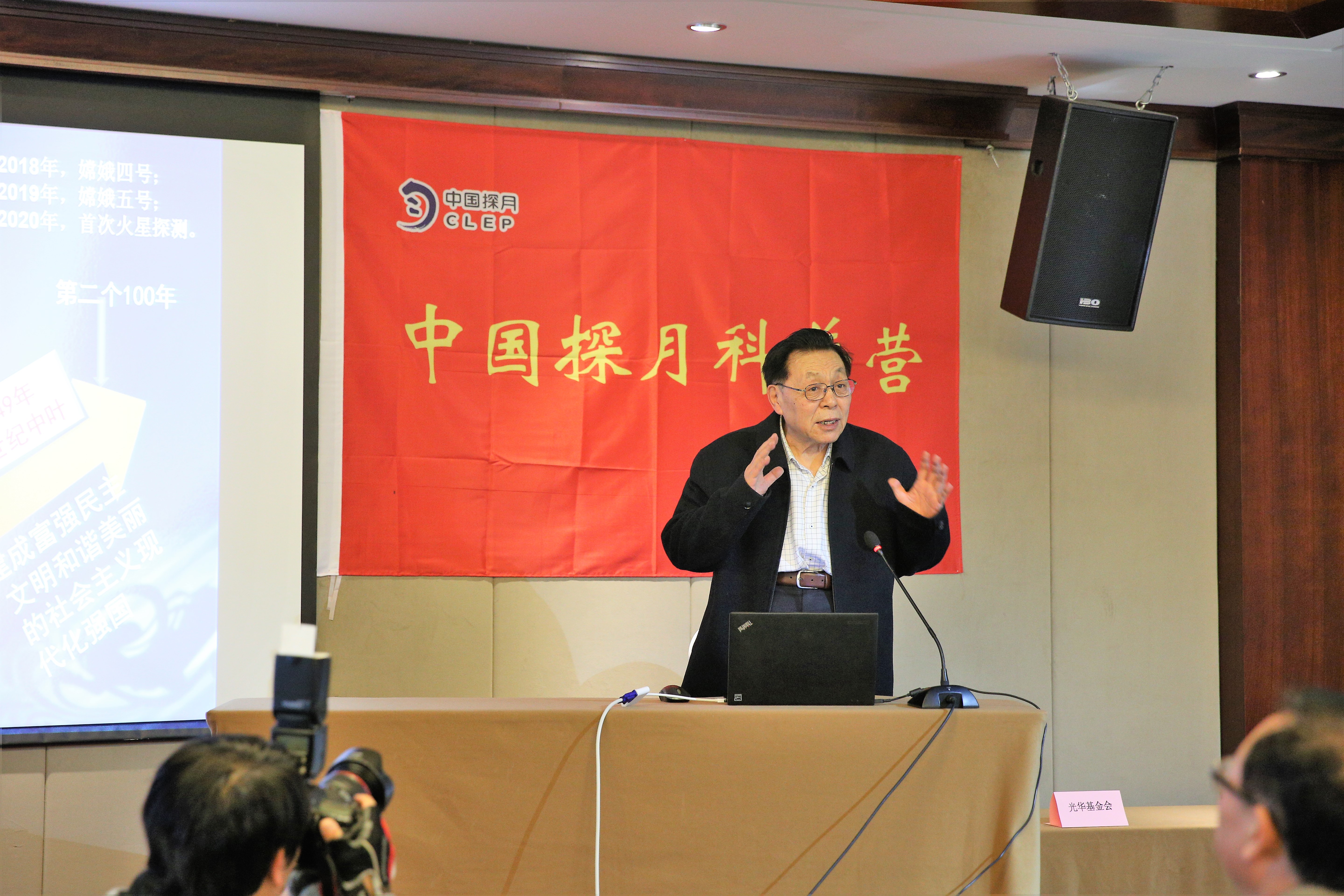 12月9日,在嫦娥四号成功发射后,“嫦娥之父”、中国探月工程首席科学家欧阳自远院士来到西昌,在由中国光华科技基金会与嫦娥奔月航天科技(北京)有限责任公司联合举办的首届光华探月营启动仪式上,进行了主题为“迎接第一个100年,中国的月球和火星探索”的演讲。
