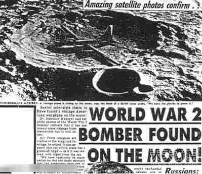 除了一些书籍传言,一些不实的新闻报道也为月球背面蒙上了神秘、诡异的面纱。其中,引起世界轰动的一次是1988年4月5日,《世界新闻周刊》在一篇名为《WORLD WAR 2 BOMBER FOUND ON THE MOON!》的新闻报道中,刊登了一张照片,说二战时期,美国的轰炸机群经过百慕大三角时,一架轰炸机无故失踪,被外星人劫持到了月球背面的撞击坑中。