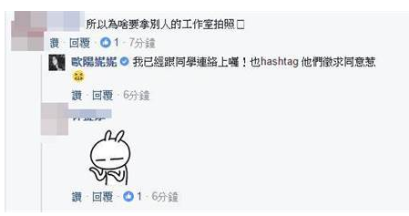 欧阳妮妮因为擅闯他系工作室拍照遭警告的消息传出,吸引了不少网友在她社交媒体上留言:“所以为啥要拿别人的工作室拍照”,对此欧阳妮妮回复:“我已经跟同学连络上咯!也征求他们的同意了。”希望风波能就此平息。