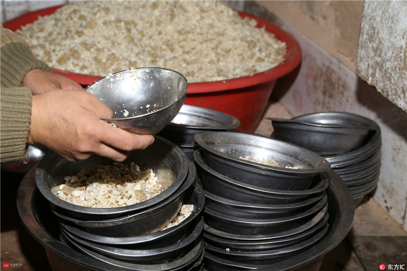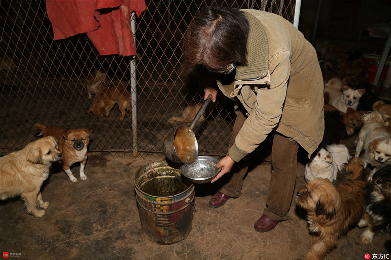 当问及现在的经费来源时,文丽老师说,一部分是靠社会救济,另一部分来源于自己打工挣钱。记者采访时注意到,文丽老师在给240只小狗狗喂食的时候,将小狗狗分成10批来喂,以此避免狗狗之间因为争抢食物发生伤亡事件。图为文丽老师正准备喂狗。