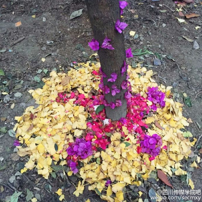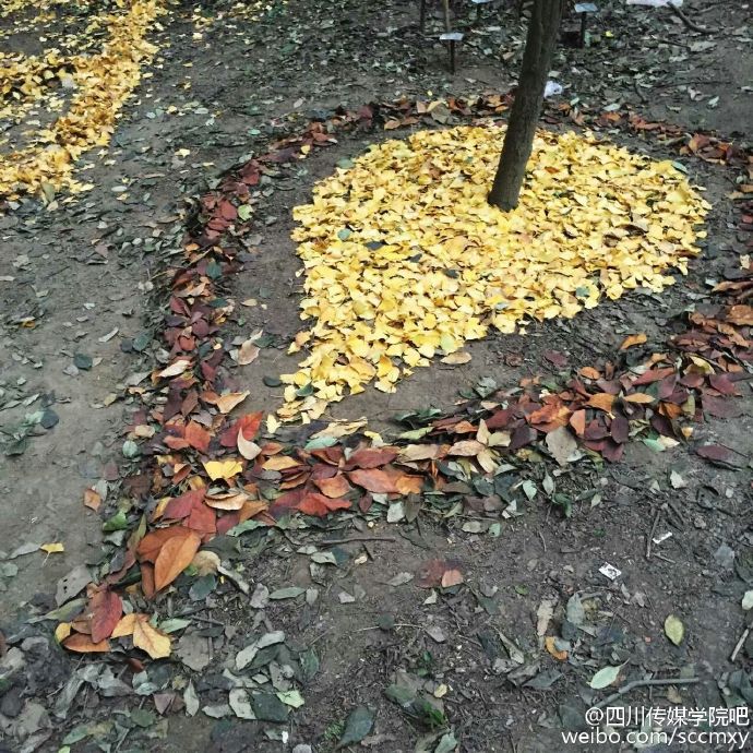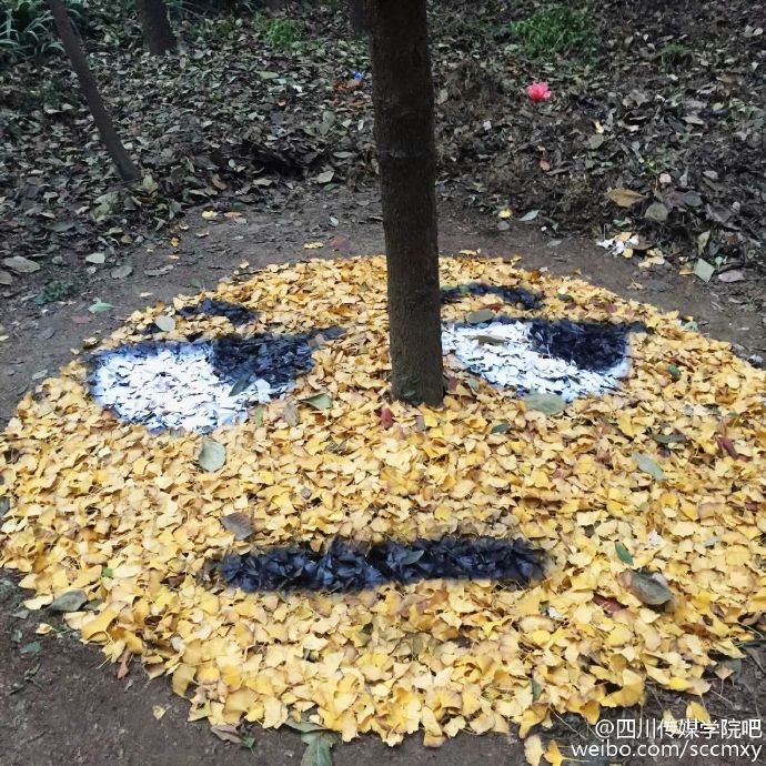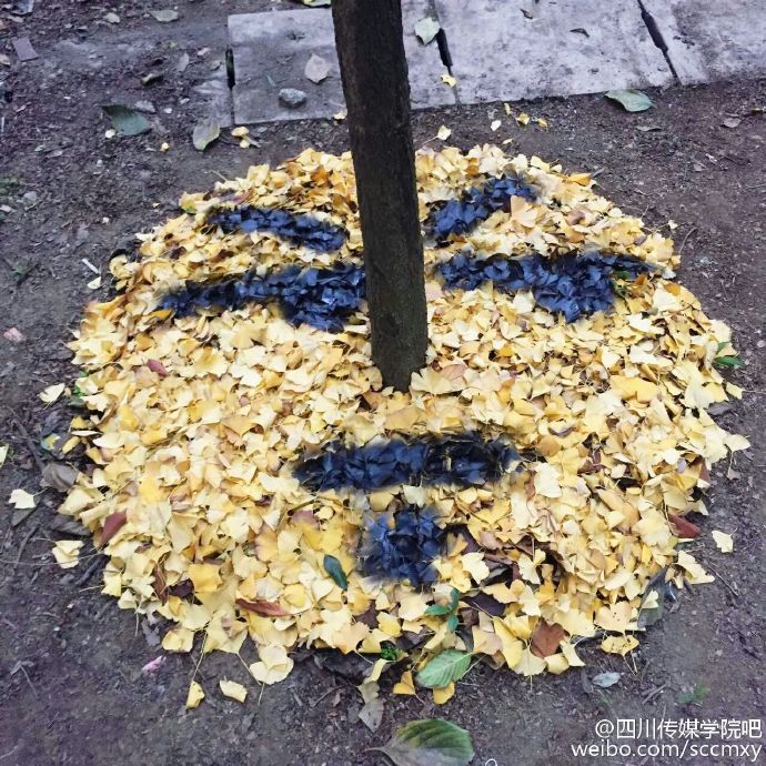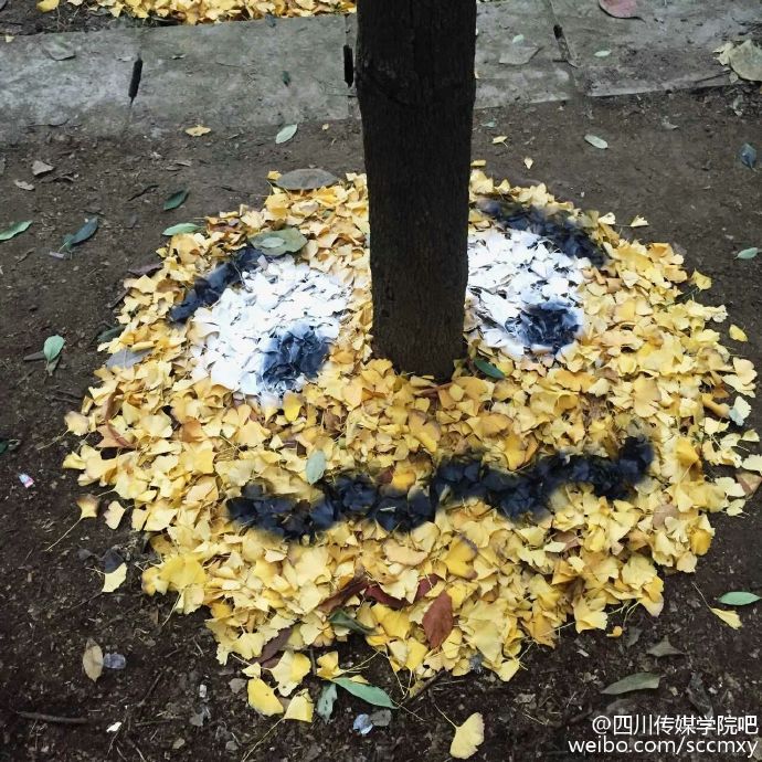 四川传媒学院15级艺术设计与动画学院雕塑专业的同学们将萧瑟的落叶归置后,再进行了一番艺术加工,瞬间变废为宝!