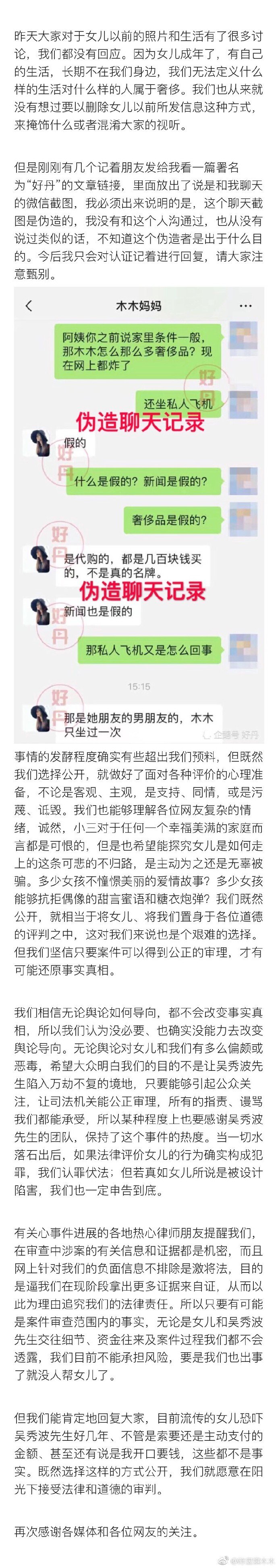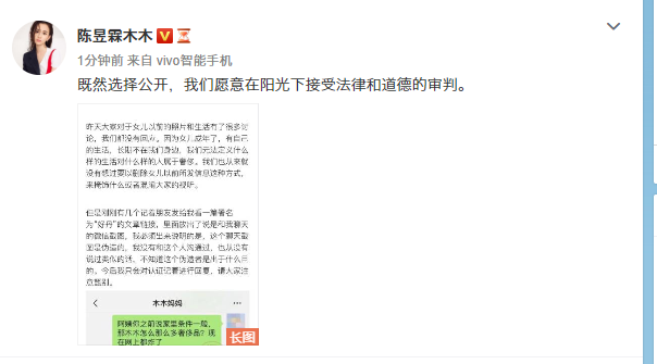1月21日,自媒体号“好丹”晒出了聊天记录称陈昱霖妈妈否认女儿生活奢华,表示都是代购的假货。针对这位自媒体的报道 ,1月21日晚6时30分,陈昱霖父母发微博回应近期传闻,表示“既然选择公开,我们愿意在阳光下接受法律和道德的审判。”