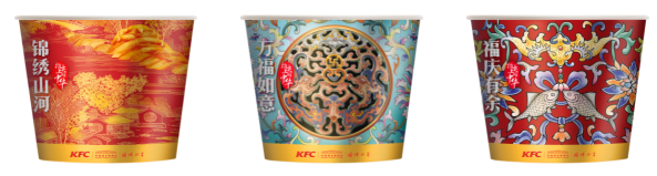 值得一提的是,肯德基此次从“黑漆带托泥描金山水楼阁纹宝座”和“粉彩镂空夔龙纹转心瓶”两件国宝及其技艺中获得灵感启发,特别设计了“锦绣山水描金桶”、“万福如意粉彩桶”和“福庆有余粉彩桶”三款肯德基新春限定非遗国技主题桶,巧妙地将中国人喜爱的喜庆元素“蝙蝠(福)”、锦鲤、山水以描金、粉彩国技的专属质感呈现,传递中国传统文化中美好的新年祝愿。