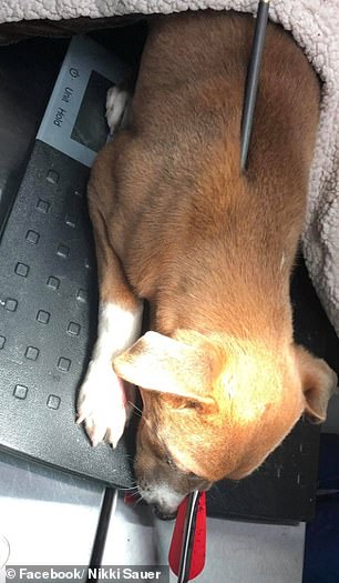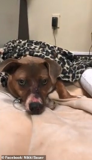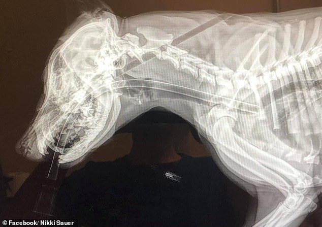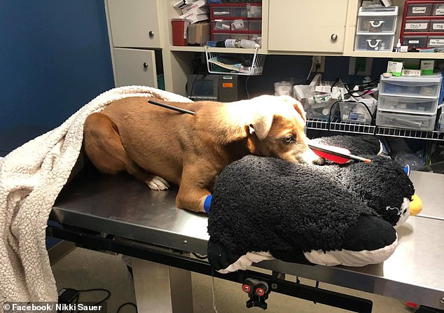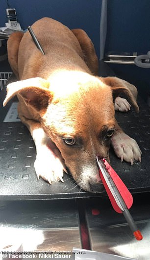 据Paws and Paws动物诊所的实习经理Nikki Sauer说,这只名叫Loca的小狗是在她家的后门廊被发现的,它的头部被一只利箭射穿。