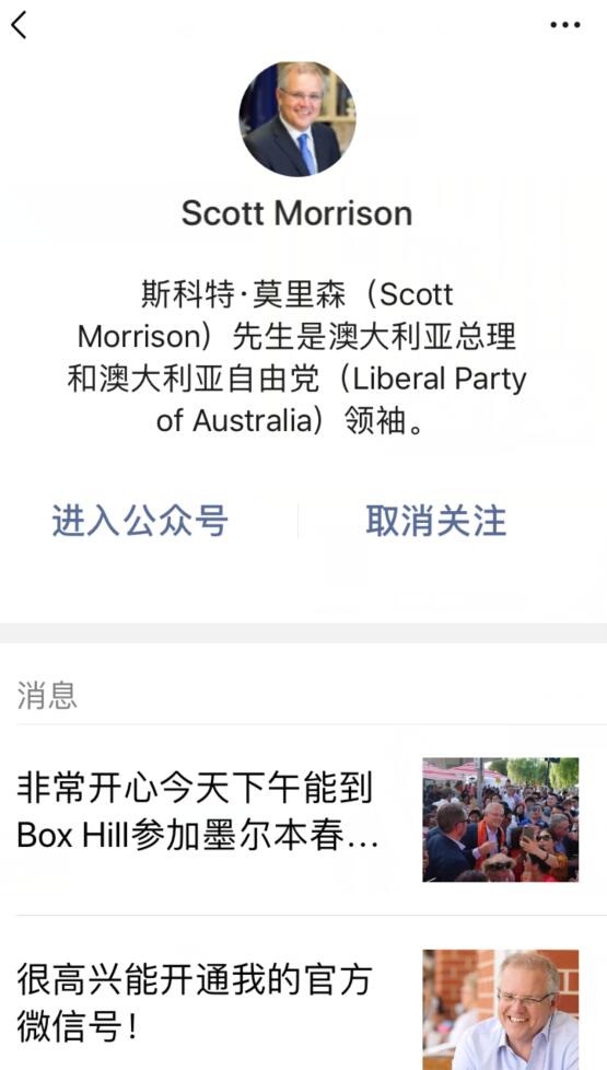 近日,为了更好地与澳大利亚华裔社区沟通,澳总理莫里森开通了官方微信公众号。