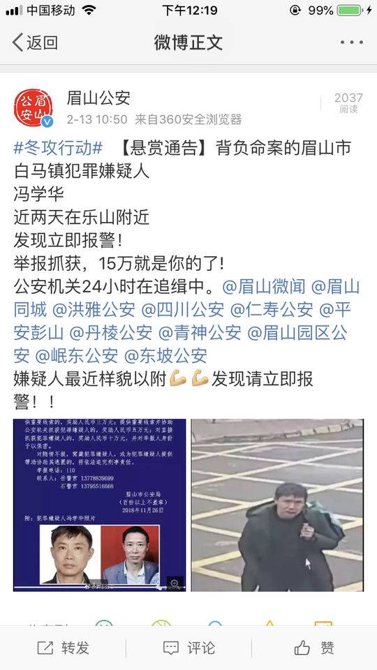 记者注意到,根据眉山警方此前发布的悬赏通稿显示,2017年12月4日、5日,眉山市东坡区白马镇桥楼村、修文镇先后发生两起恶性案件,冯学华具有重大作案嫌疑。而今年2月16日正好是冯学华50岁的生日。此前,眉山警方曾将冯学华的悬赏金额提到了15万元!
