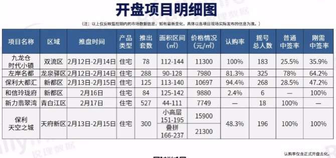 2月11日-2月17日,成都锐理数据共监控到6个住宅项目开盘,共推房源1402套,有数据可统计的5个楼盘共成交577套,成交率66%,其中左岸名都、和信玲珑府、新力翡翠湾为首次开盘。