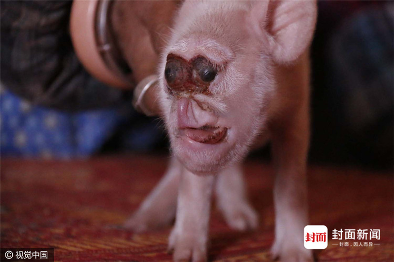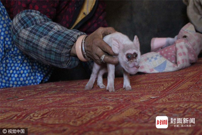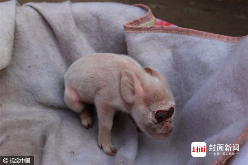 据了解,这头母猪已经是第四次产仔,配种的公猪是本村另外一位村民所有,母猪一直在家中圈养,并没有散养出去。这头长相怪异的小猪仔生下来时大约只有一斤多重,现在体重已经增加到了近3斤。图/视觉中国