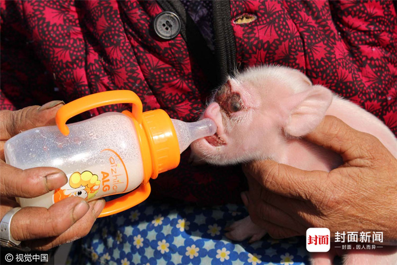 由于这只小猪崽不会吸奶,于是林某用牛奶装在奶瓶里给小猪喂食。