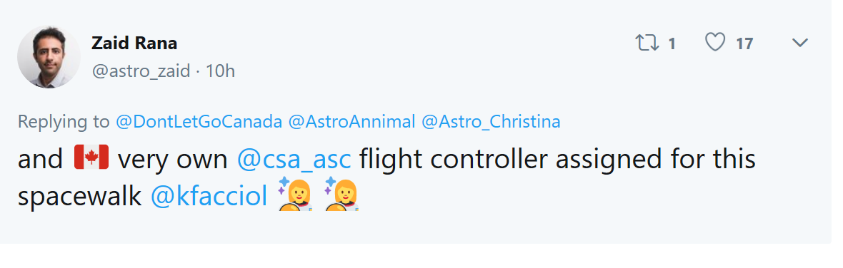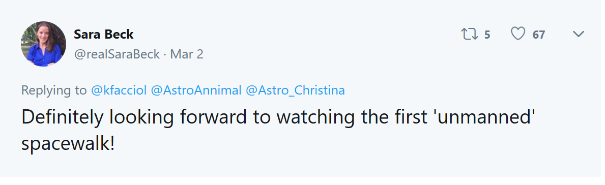 宇航员Christina Koch随后也在推特上证实了这一消息,但表示不知道太空漫步需要持续多长时间,但透露大约会在5到8小时之间。