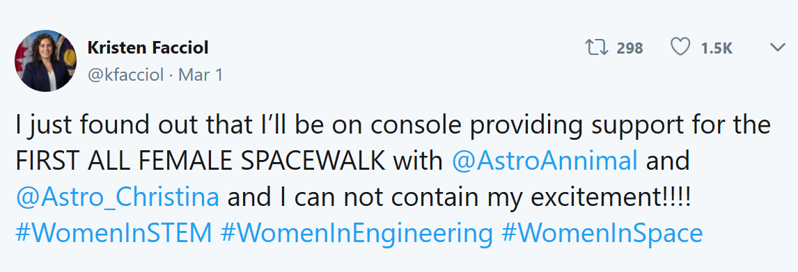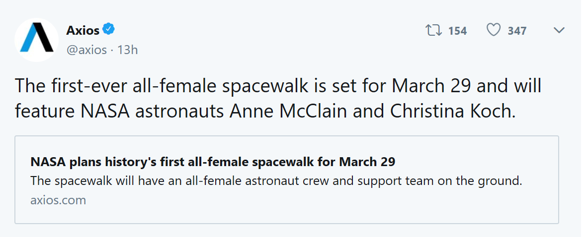 该消息最先由The Hill在推特上爆出,不久包括Axios、Aerospace industries等新闻媒体跟进,表示“3月29日,这两名女性宇航员将在太空上迈出历史上无与伦比的一步”。
