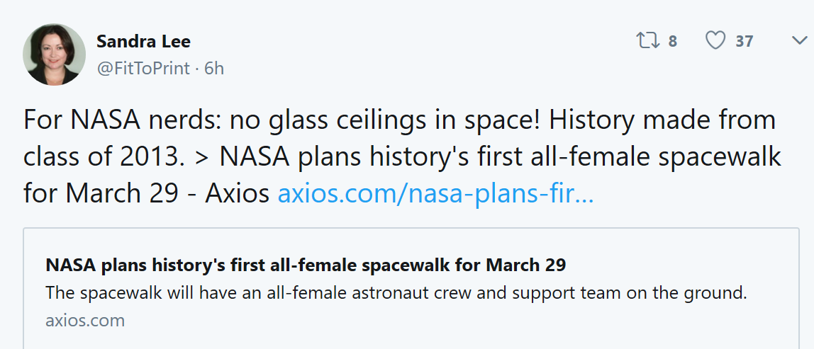 还有网友各种p图来庆祝“女性历史月”,直呼“向对NASA的书呆子们说:太空里没有玻璃天花板”,“期待看这一次没有‘男人’的太空漫步了”。