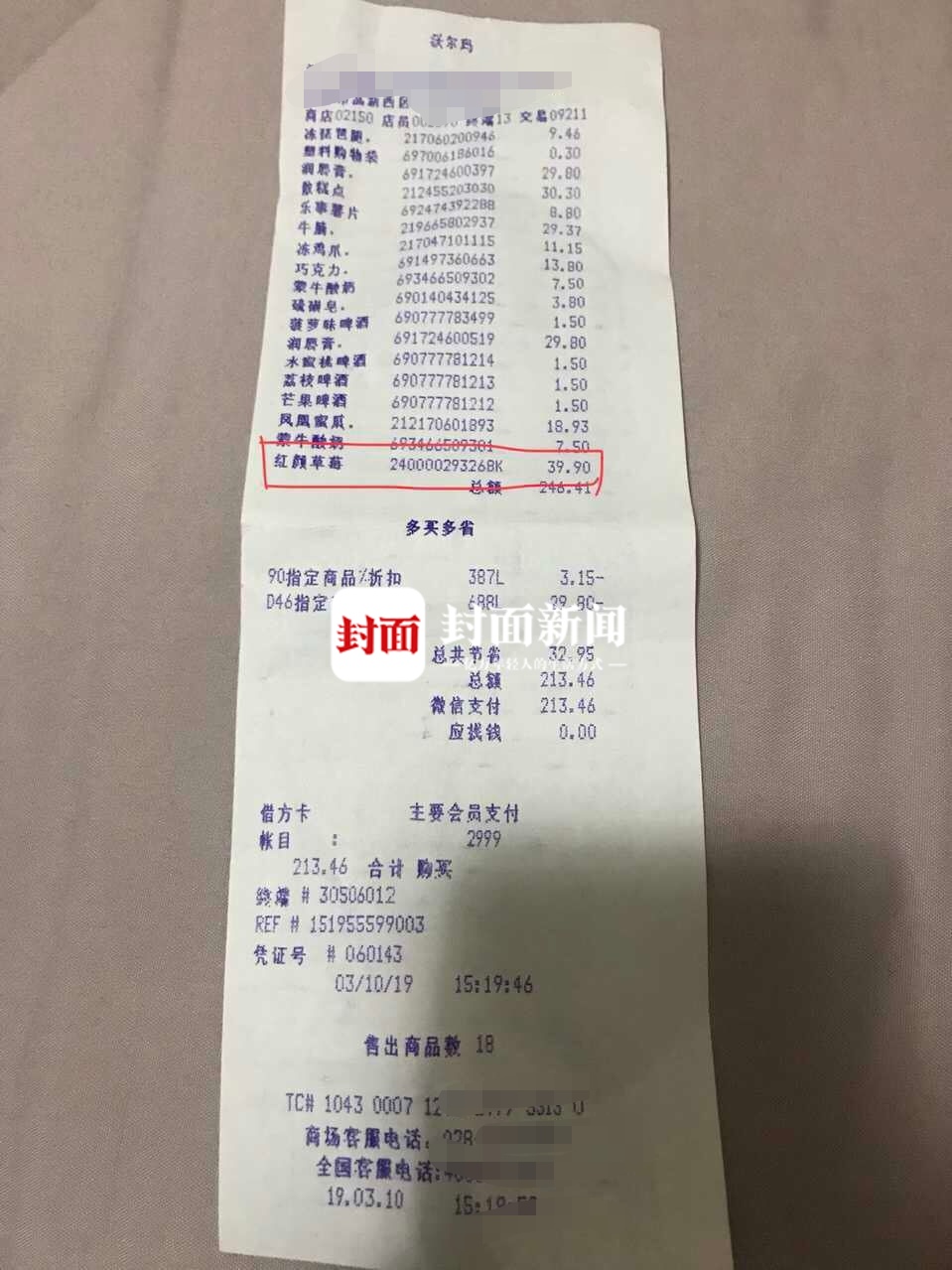 记者在徐梅提供的购物收据中看到,她当时购买了包括巧克力、薯片、酸奶、啤酒等众多商品,总额为246.41元,结算下来支付了213.46元。