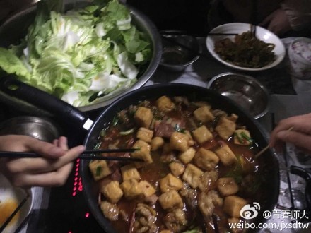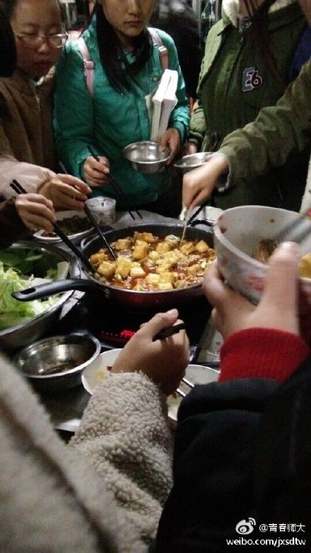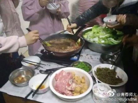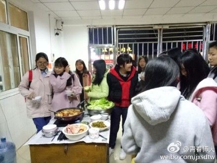日前,住在江西师范大学学生宿舍六栋的同学们下了晚自习回到宿舍发现,宿管阿姨在宿舍楼下贴心地为大家准备了热腾腾的火锅!