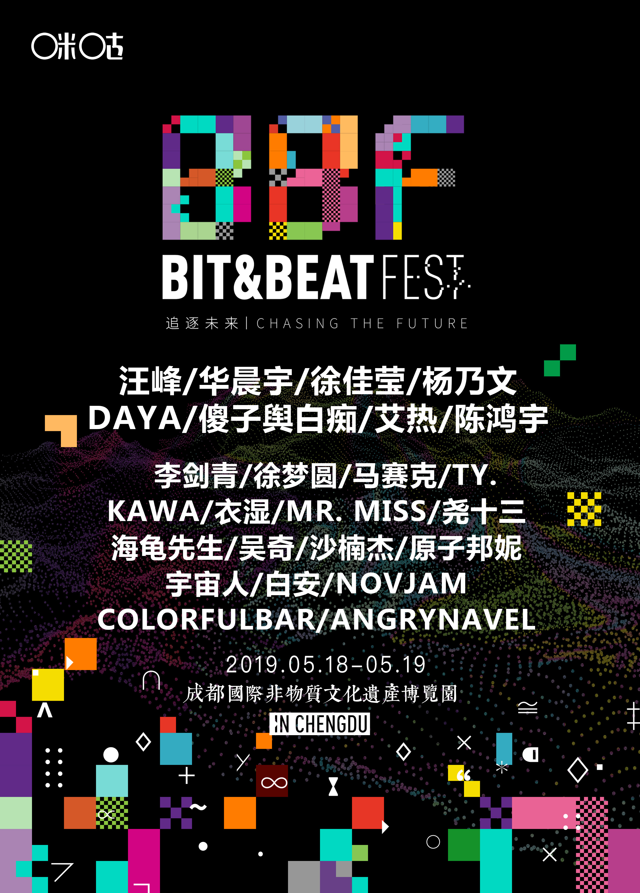 5月18—5月19日,5G时代首个音乐节——由咪咕音乐重磅打造的2019 BBF比特节拍(BIT&BEAT FESTIVAL)音乐节强势来袭,定位成都。以5G网络全覆盖,两大舞台场景混搭多元音乐类型,邀请所有最“不惧定义自己”的你,与汪峰、华晨宇、徐佳莹、杨乃文、DAYA、傻子舆白痴、艾热、陈鸿宇、李剑青等音乐人,共赴音乐与科技融合的未来世界。