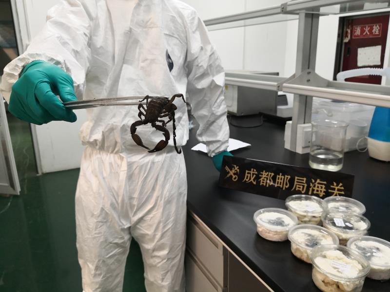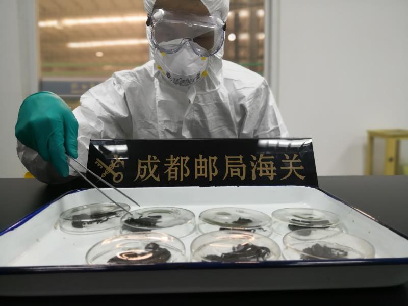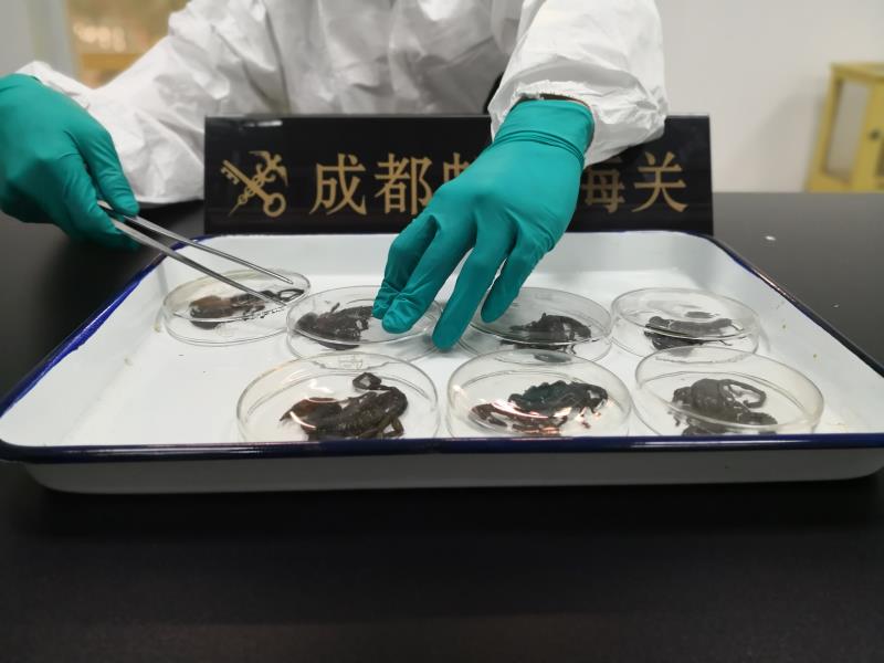 一件无申报品名进境邮件在X光机图像上显示异常,现场关员立即开包查验。日前,成都海关在对进出境邮递物品监管过程中,截获8只蝎子。