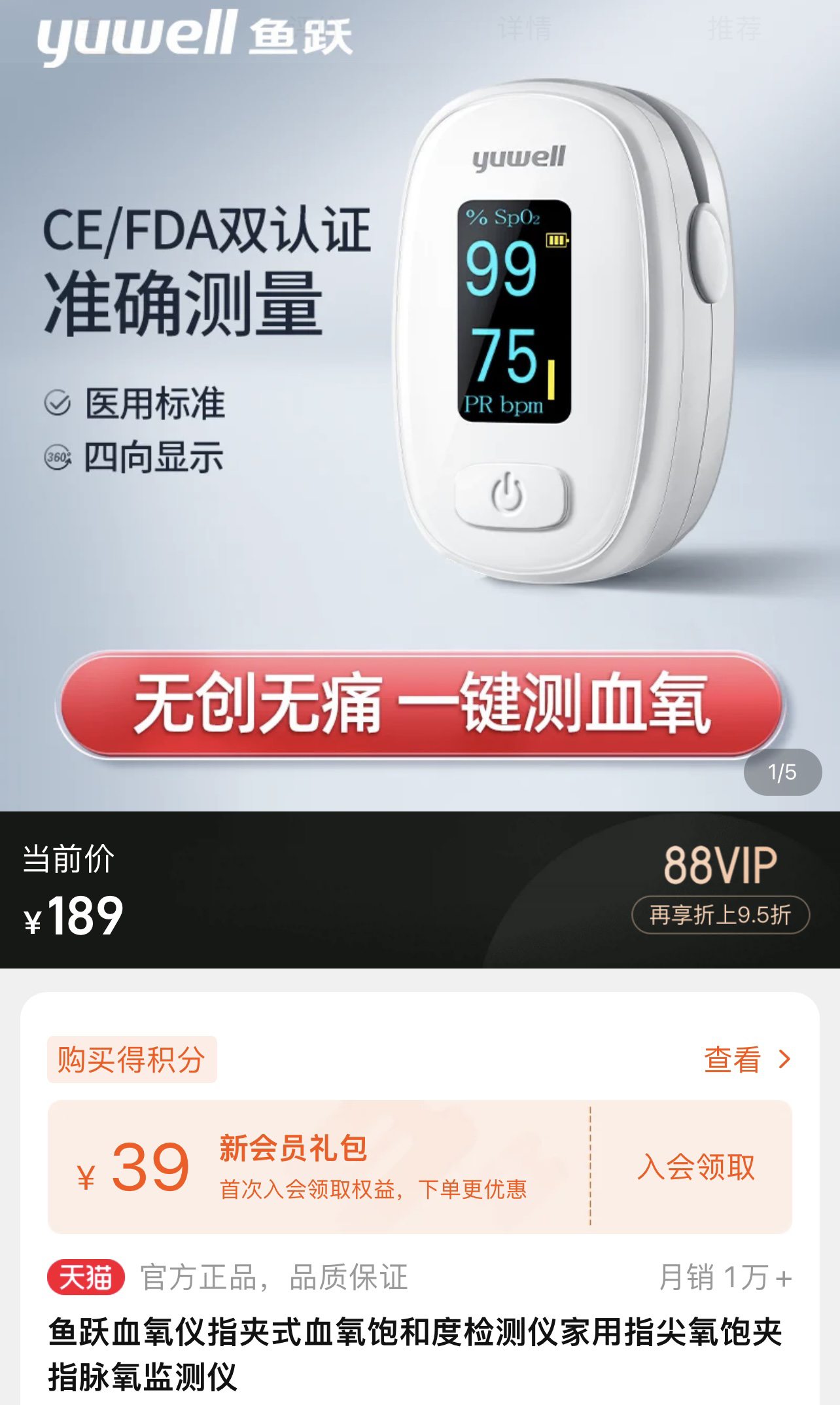 2月1日,记者在淘宝和京东“鱼跃官方旗舰店”上看到,型号为YX306的血氧仪标价均为189元,有网友在其官方旗舰店留言称,加购时仅80多元。