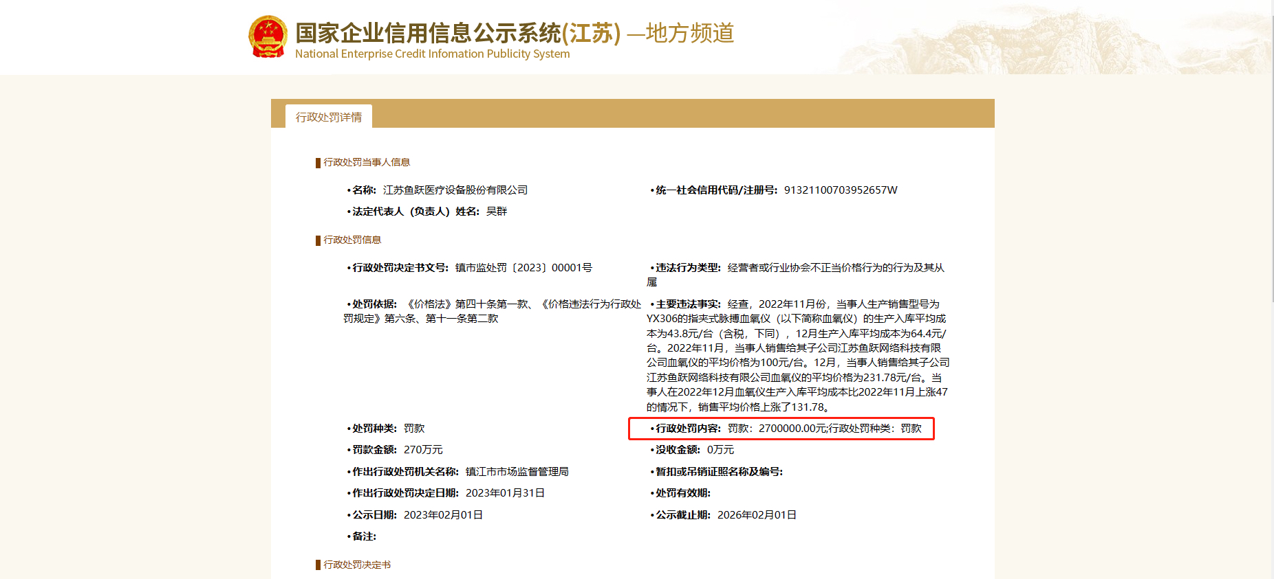 2023年2月1日,江苏省镇江市市场监督管理局对江苏鱼跃医疗设备股份有限公司开出罚单,以不正当价格行为对江苏鱼跃医疗设备股份有限公司处以270万罚款。