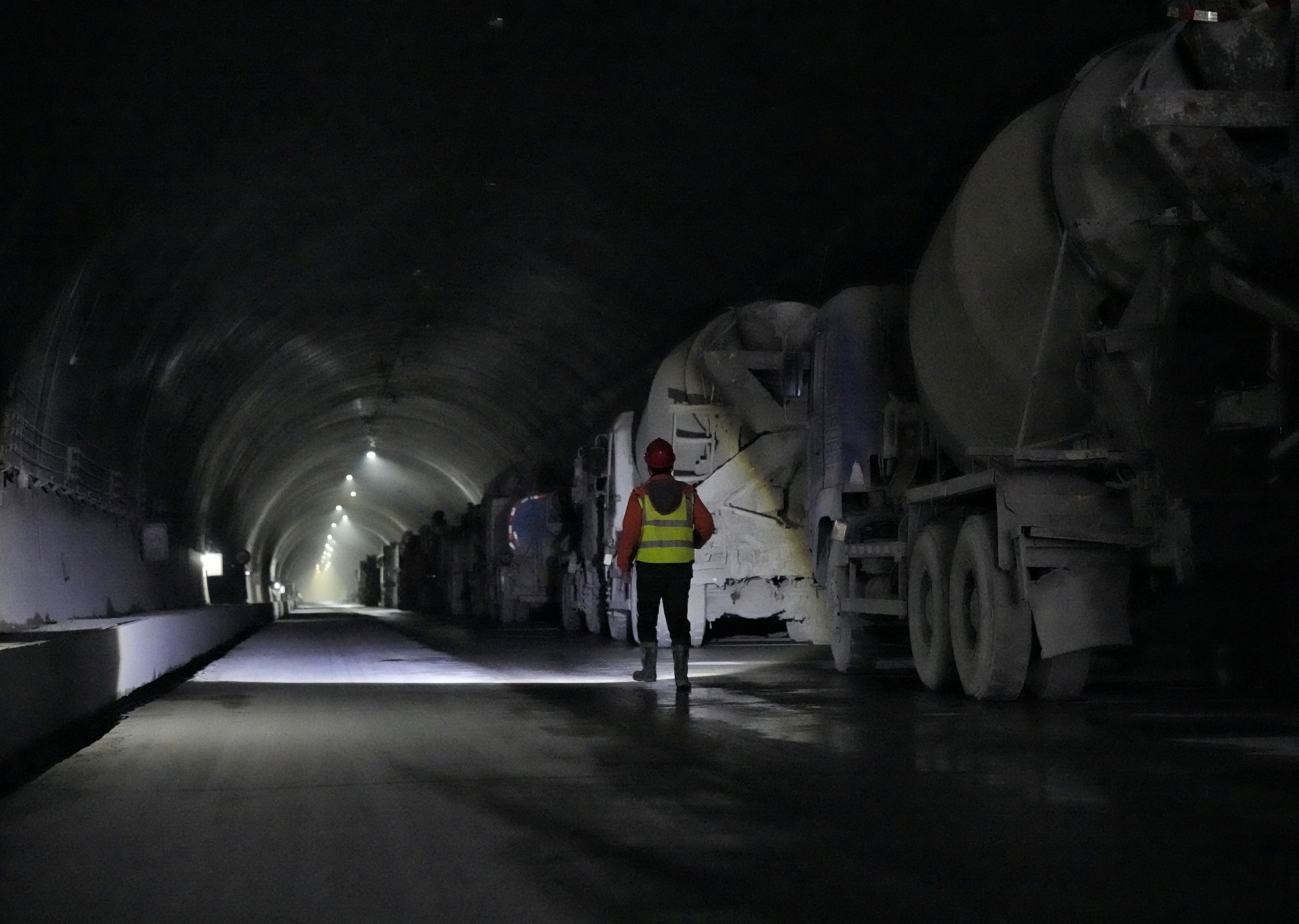在其中一个正在掘进的隧道,记者乘车从隧道洞口进入、行进3公里多,到达了掌子面施工现场。现场温度也从洞口处的寒冷刺骨升至10多摄氏度。