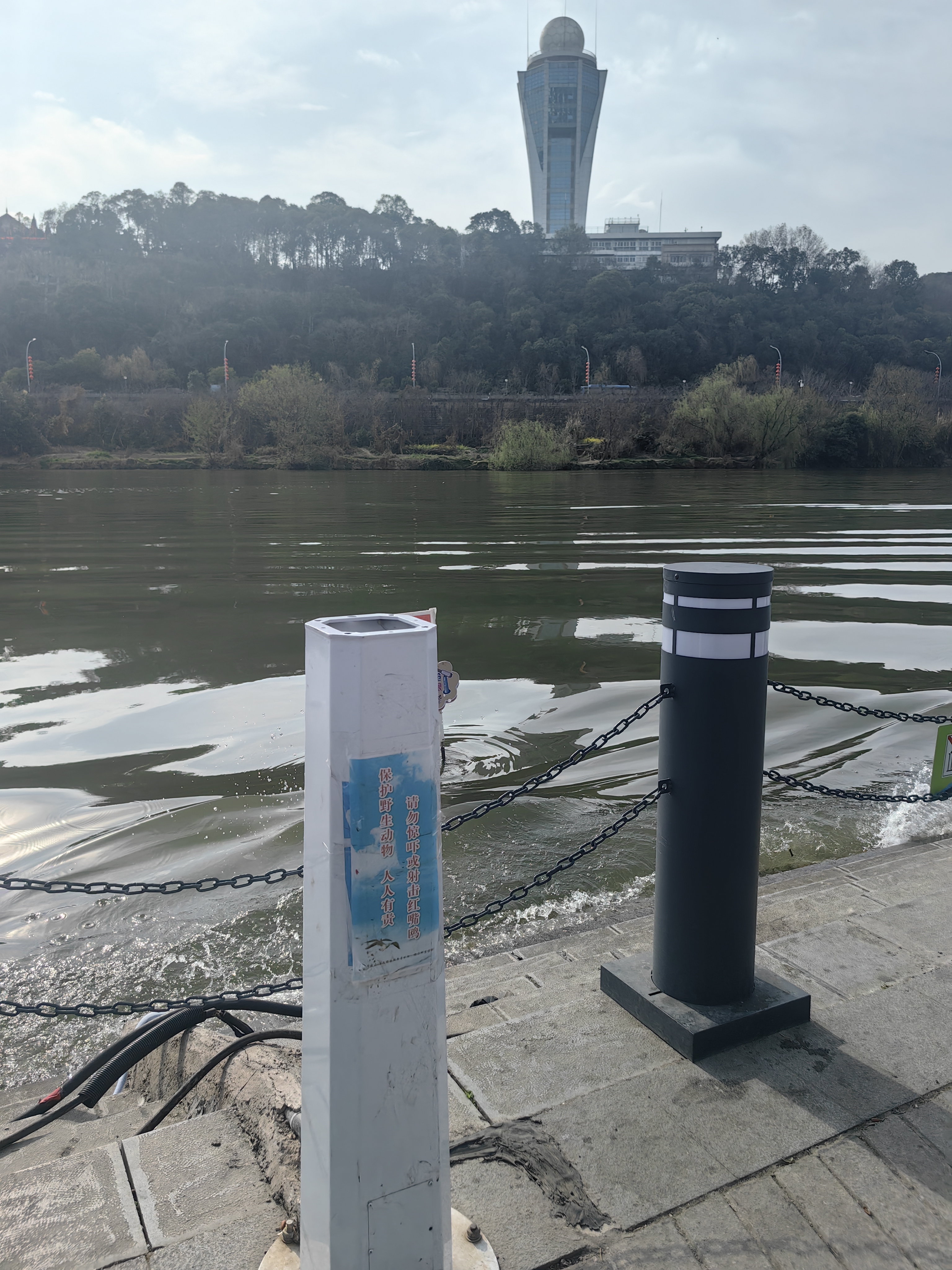 2月26日上午,记者来到安昌江三江半岛位置,看到江边“网红水枪”已被撤除,只剩下两个基座。在水里的“保护野生动物”标牌上,还留有“网红水枪”的宣传标语。