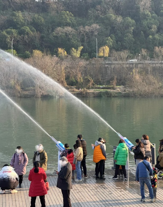 该网友说,随着绵阳生态环境的改善,每到冬季,红嘴鸥会成群结队地飞回绵阳过冬。“而三江半岛是大家观赏各种鸟类的最佳位置。”景区在此处摆设“网红水枪”,是否会惊扰到栖息于此的各种鸟类?