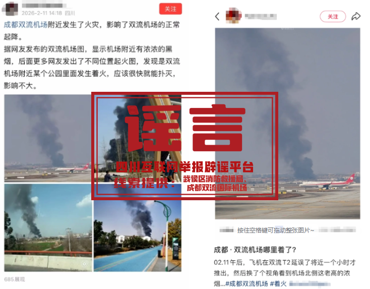 2月11日14时许,多位网民发帖反映成都双流机场附近发生火情,询问“双流机场哪里着火了”,称“影响了双流机场的正常起降”“航班延误近一小时”等,并配机场上空浓烟图片,引发一定关注讨论。