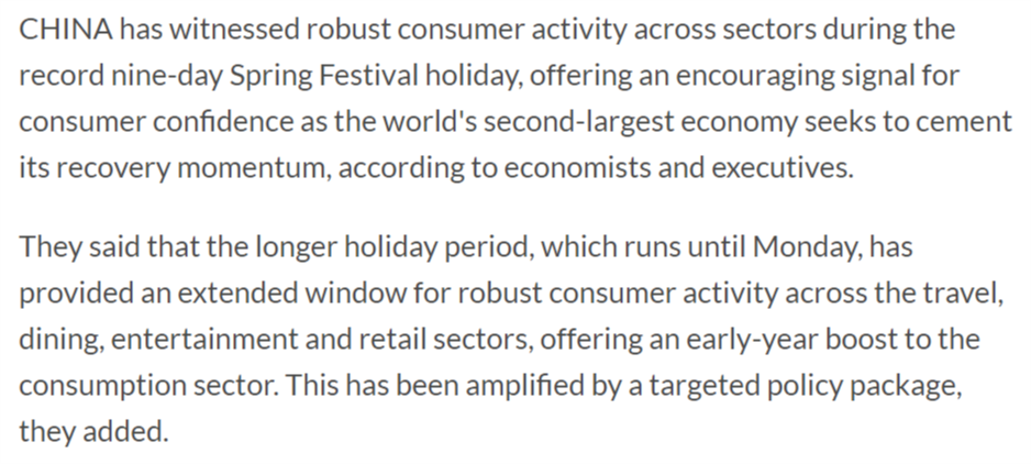 马来西亚《星报》23日报道称,在创纪录的9天春节假期期间,中国各领域消费活动强劲,这为世界第二大经济体巩固复苏势头传递了积极信号,也彰显了消费者信心。