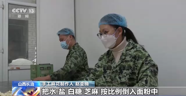 手工麻花制作人 赵亚楠:把水、盐、白糖、芝麻,按比例倒入面粉中,让面团有足够的发酵时间,在搓麻花时,需要注意力度,这样子炸出来的麻花才会香酥可口。