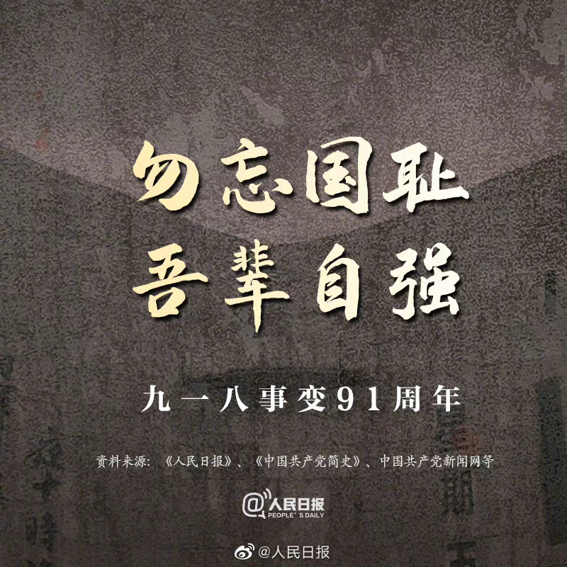 1931年9月18日,九一八事变爆发,中国人民在白山黑水间奋起抵抗,成为中国人民抗日战争的起点。历经14年浴血奋战,中国人民在近代以来第一次取得了完全胜利的民族解放斗争。91年了,硝烟散尽,警钟长鸣。牢记九一八!