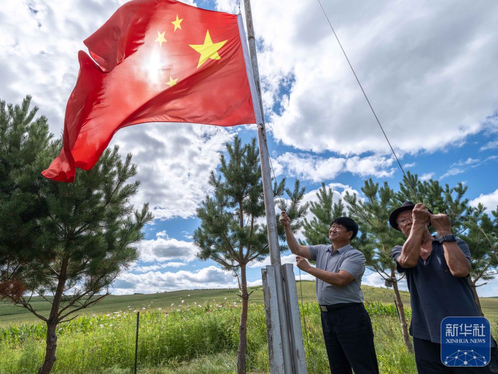 ↑8月23日,内蒙古呼伦贝尔市阿荣旗六合镇,孙福贵(左)与村民李洪海在“红军岗”上升旗。新华社记者 马金瑞 摄
