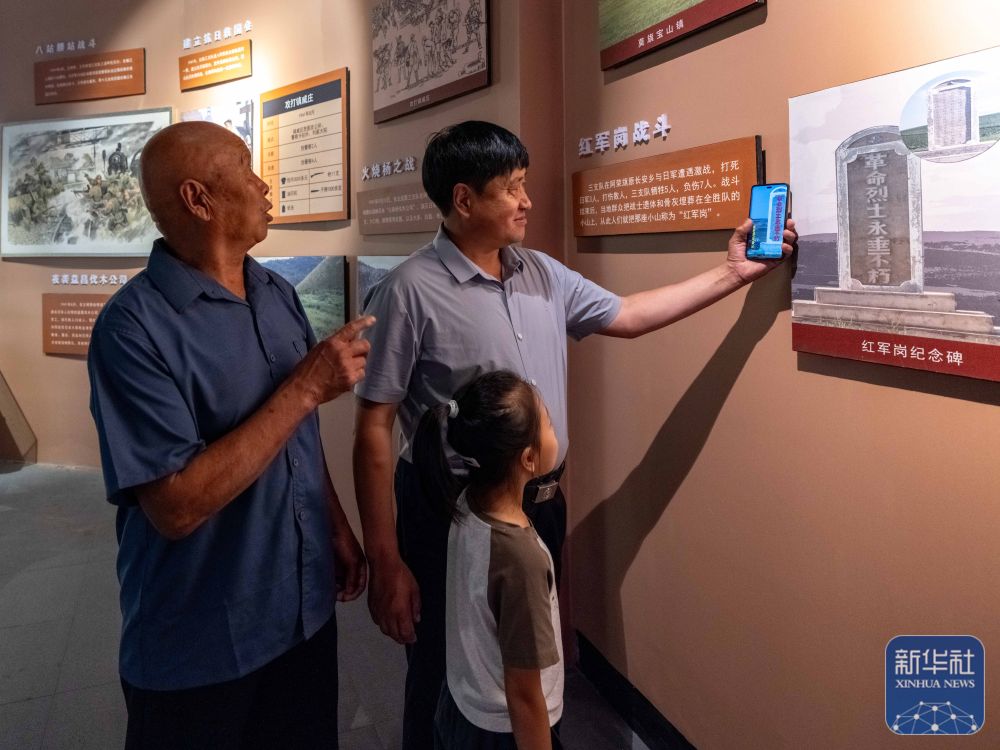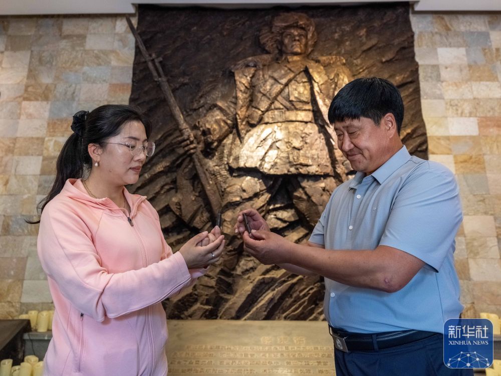 ↑8月23日,内蒙古呼伦贝尔市阿荣旗,孙福贵(右)在呼伦贝尔东北抗联纪念馆中向家人展示由他粉刷的老纪念碑。新华社记者 马金瑞 摄
