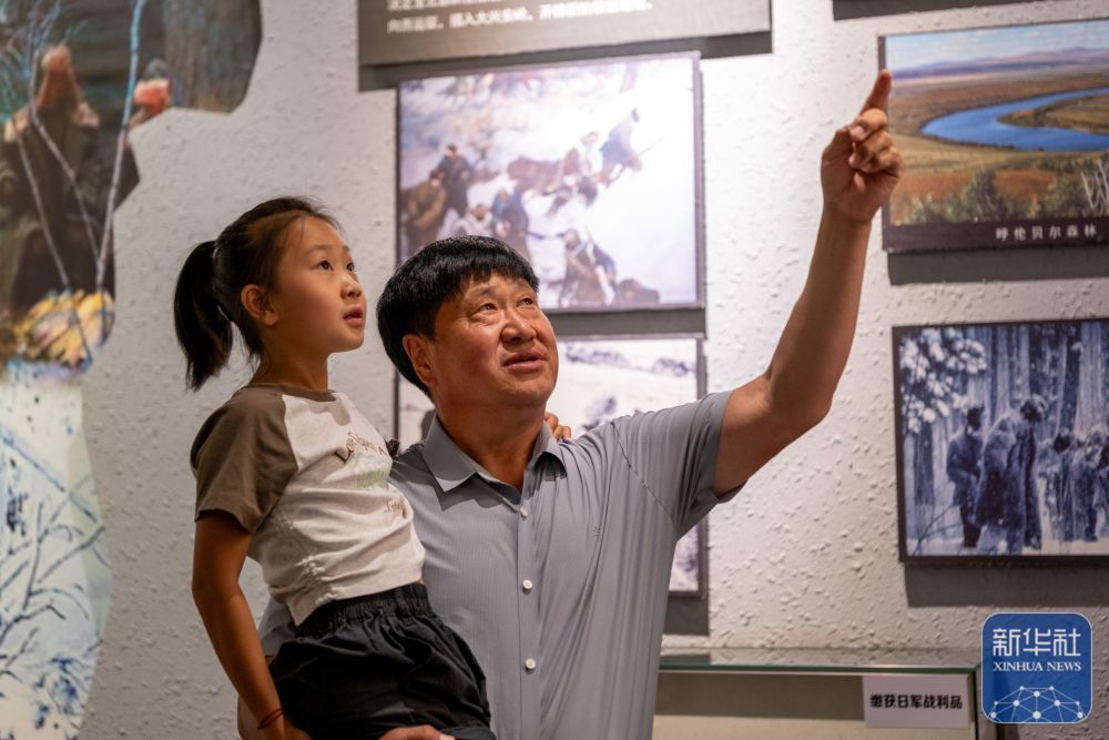 ↑8月23日,内蒙古呼伦贝尔市阿荣旗,孙福贵在呼伦贝尔东北抗联纪念馆向孙女讲述东北抗联在呼伦贝尔地区进行敌后游击的事迹。新华社记者 马金瑞 摄